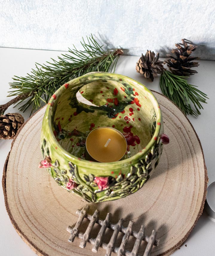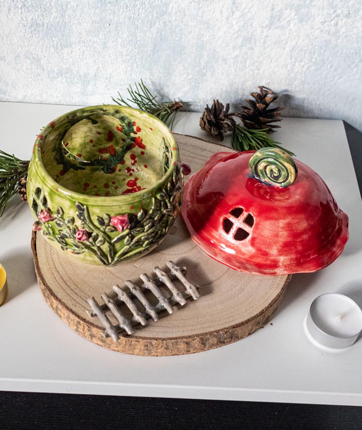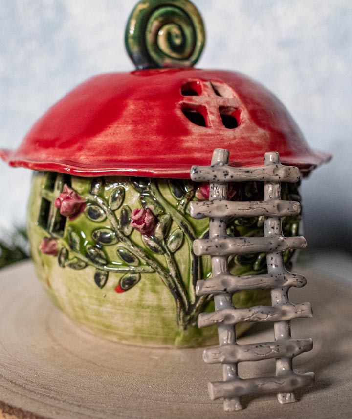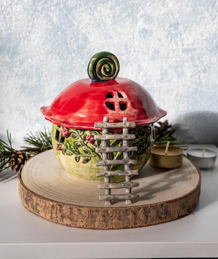 Ich habe diese schöne kleine Hütte mit viel Liebe geschaffen, jedes kleine Rosenblatt, Blatt, jede Kurve war mit einem sehr schönen Erlebnis gefüllt. Wer die Welt der Märchen mag, dem sei dieser Hütten-Kerzenhalter wärmstens ans Herz gelegt, der in jedem Raum eine wirklich schöne Dekoration darstellt und mit seinem warmen Licht eine schöne Atmosphäre in Ihr Zuhause bringt.