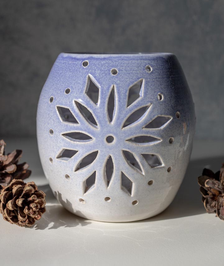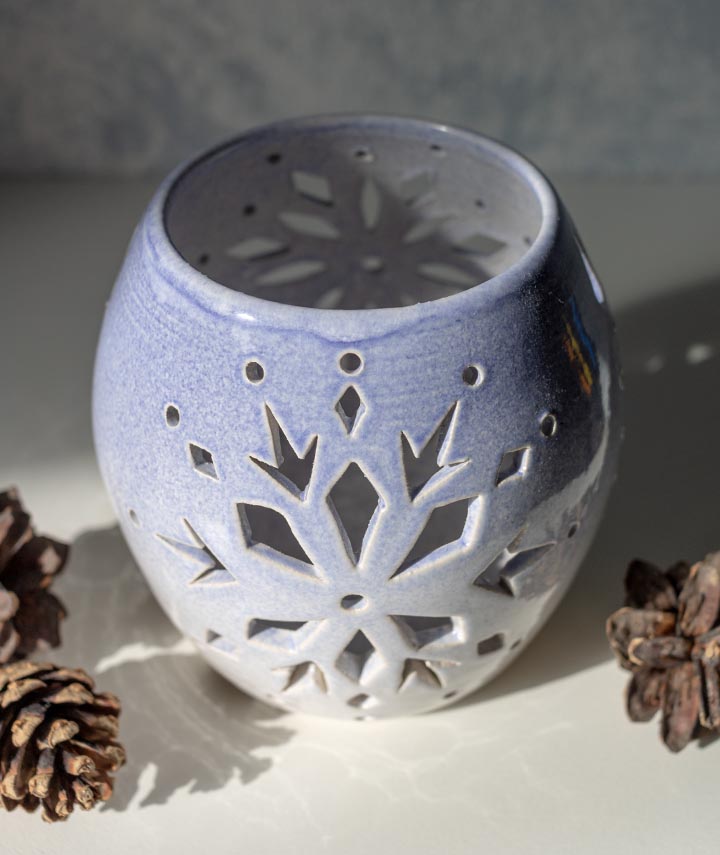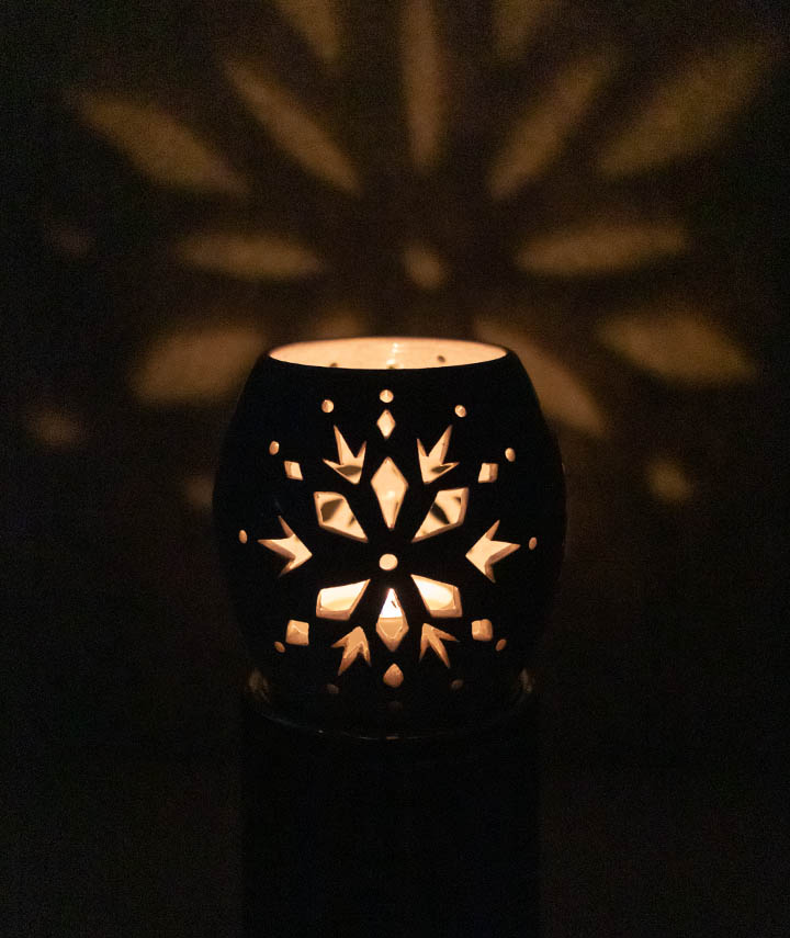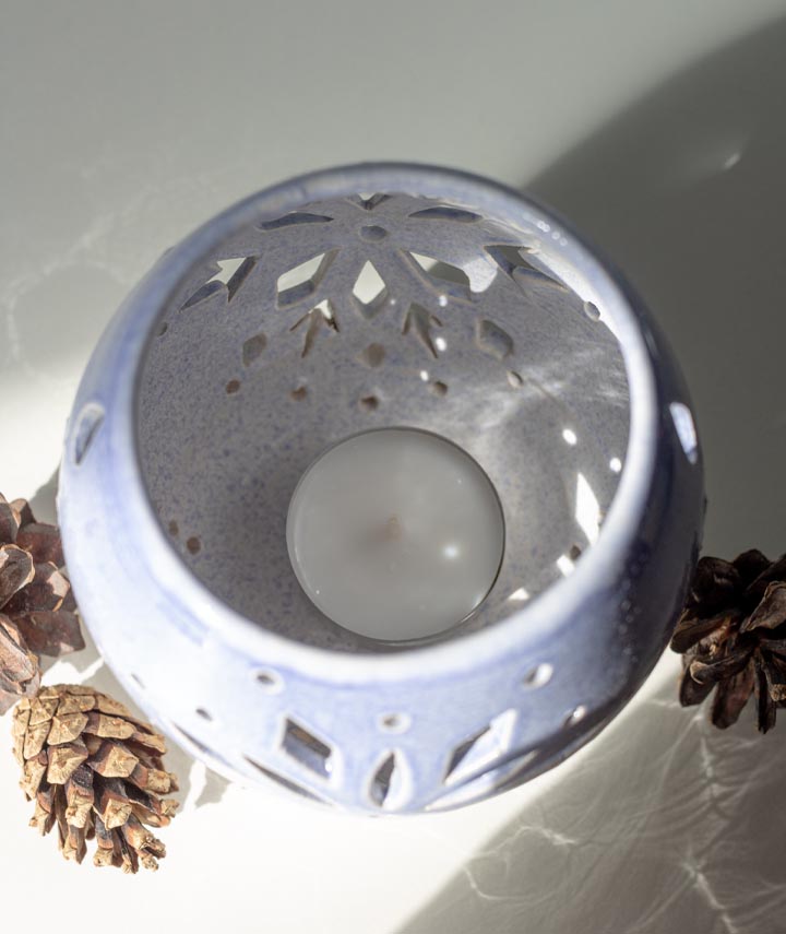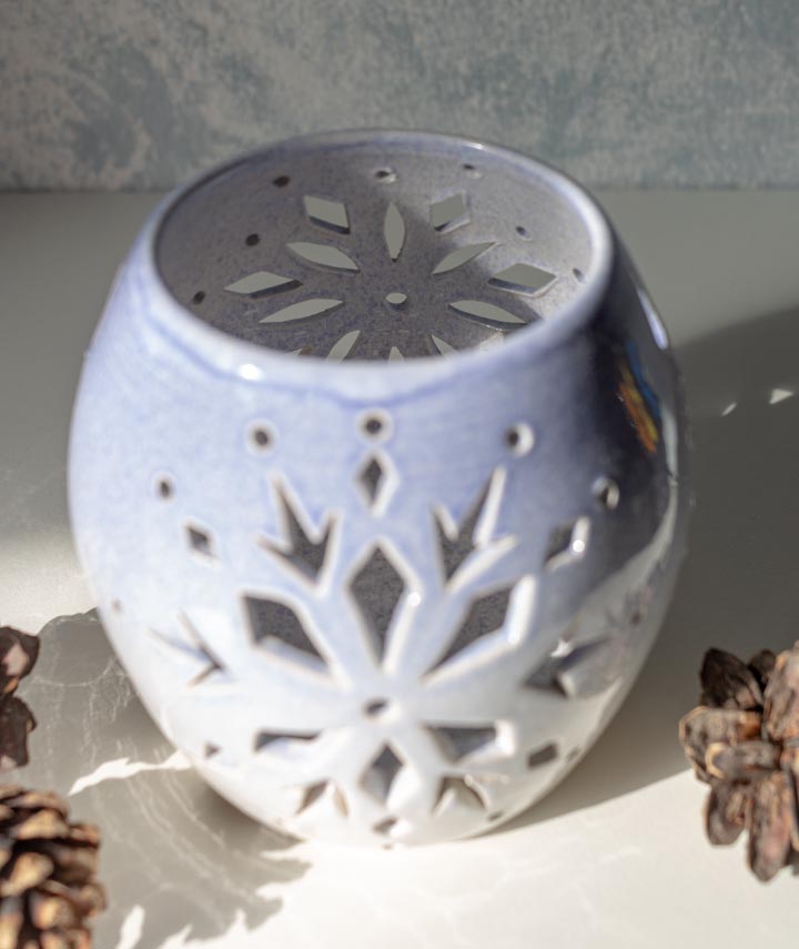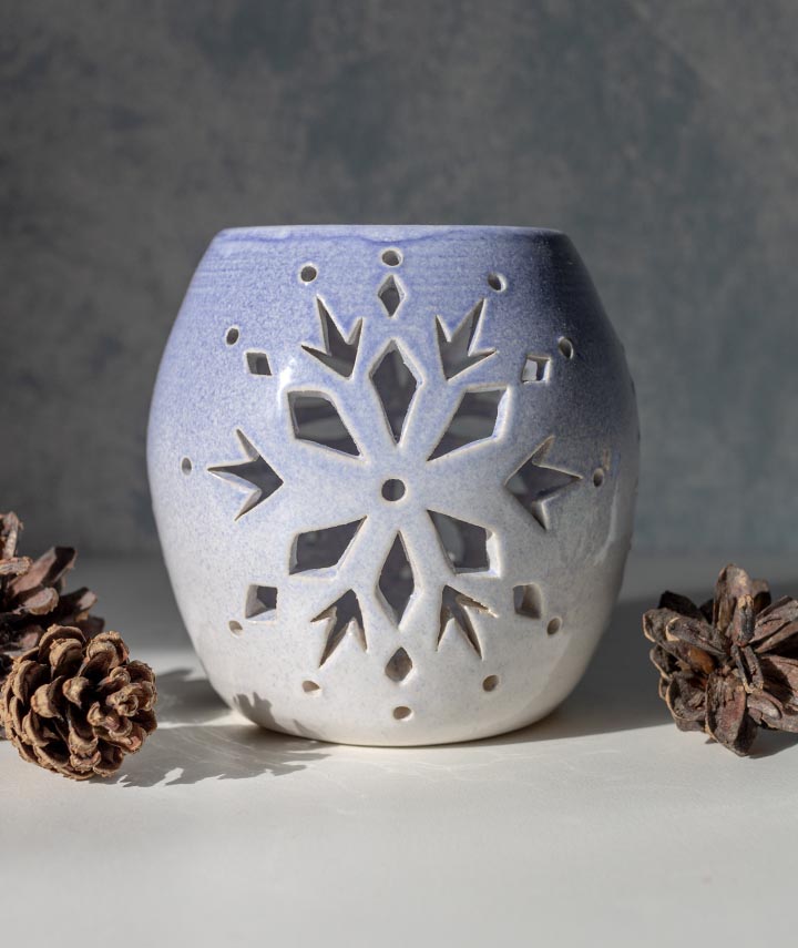 Dieser mit einem Schneeflockenmuster verzierte Kerzenhalter wurde inspiriert, als ich im Winter beobachtete, dass jede Schneeflocke, die auf mein Haar oder meinen Mantel fiel, ein anderes schönes Muster bildete. Beeindruckend und wunderbar.