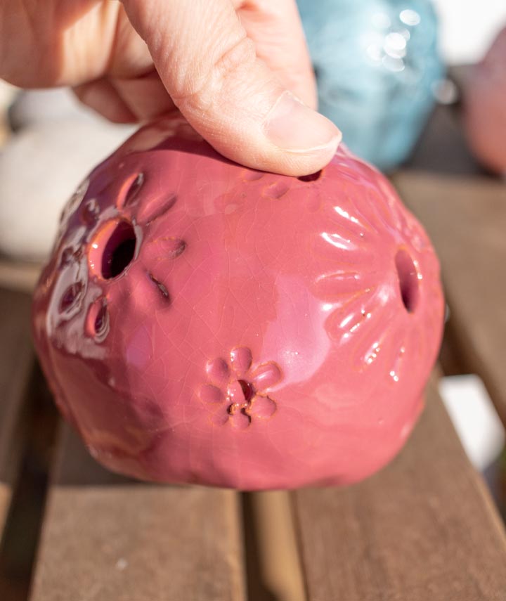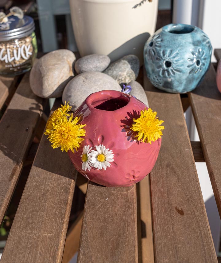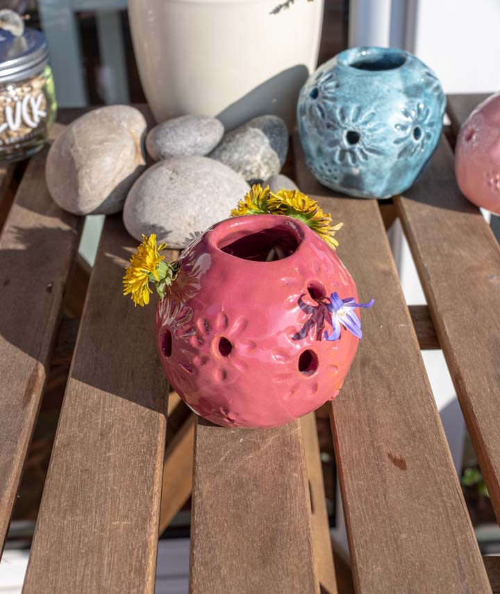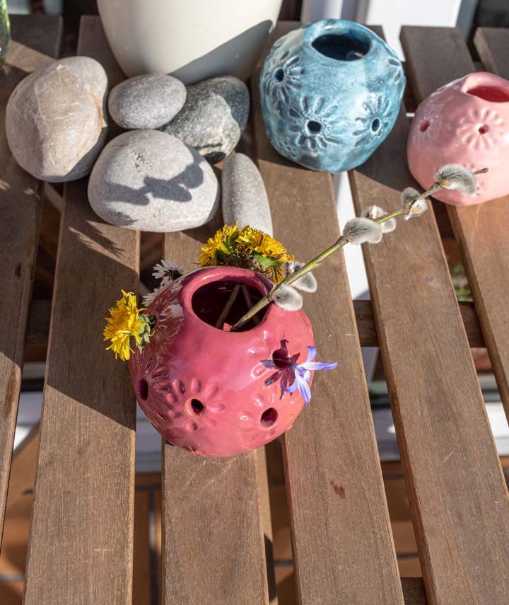 Ich habe diese kleinen Vasen mit beiden Händen geformt. Jeder hat eine völlig einzigartige Form. Die Idee kam aus dem Umgang mit kleinen Kindern in einem Kindergarten, die oft die kleinen Blumen mit sehr kurzen Stielen aufheben. Daher befinden sich Löcher in den Vasen in unterschiedlichen Höhen. Sehr kleine Blüten können in die unteren Löcher gesteckt werden und längerstielige Blüten können in die Löcher darüber oder in der Mitte gesteckt werden.